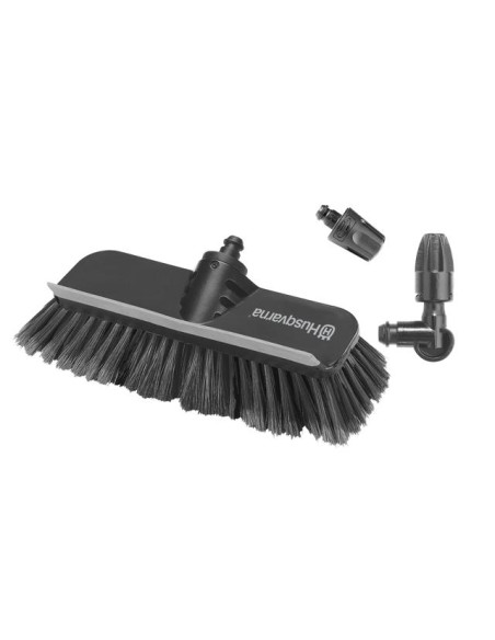Zestaw do mycia pojazdów zawiera szeroką dyszę z wirnikiem do szybkiego i delikatnego czyszczenia delikatnych powierzchni, zakrzywioną dyszę do trudno dostępnych miejsc i szczotkę do mycia z wycieraczką.